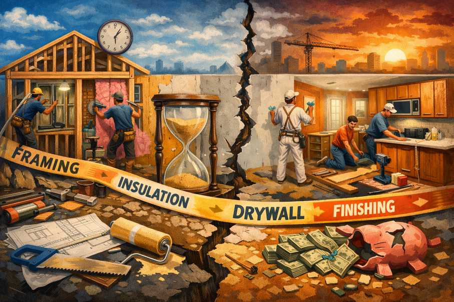 Successful construction rarely depends on dramatic moments. Most progress happens through steady steps performed in the correct order. Framing creates the structure, insulation protects the interior, drywall shapes the walls, and finishing work completes the environment people will actually live in.